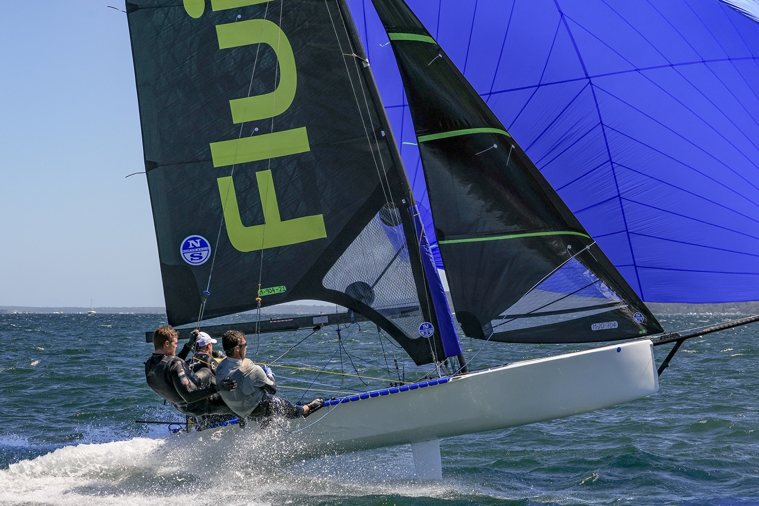 A 20-knot nor’easter straight from summer’s brochure created a perfect white-capped playing field on Belmont Bay, Lake Macquarie, for the opening race of the 2021/22 Red Pumps 16ft Skiff Australian Championships, with the main contenders quickly hitting top gear and exerting their dominance.